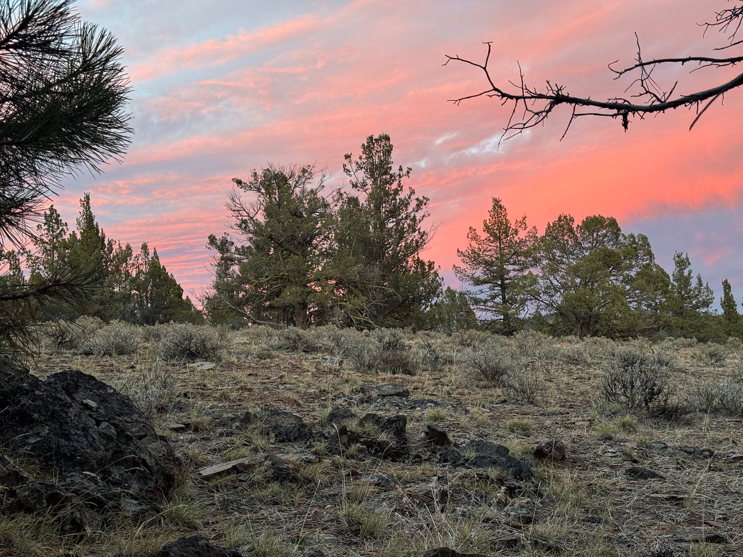 That evening, they hike to the top of the ridge. He tells her not to go higher. She wants to go higher. He listens and follows her intuition. They settle into a new juniper tree. On the ground. Smells and birds and the sunset so alive. He says he doesn’t meditate. But this is nothing short of it.